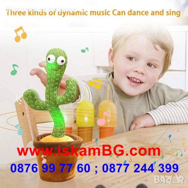 Танцуващият кактус е интерактивна играчка, която лесно може да привлече вниманието както на деца, така и на възрастни. Той може да бъде декоративен предмет както в офиса, така и у дома, който ще донесе много усмивки и добро настроение. Тази играчка е подходящ подарък за деца над две години, тъй като има много полезни и в същото време разсейващи функции, които помагат за тяхното развитие. Освен приятния и забавен външен вид, той може да танцува, привлича ви в весела атмосфера, може да пее 120 различни песни, които разбира се, малкият ще се научи и чрез функцията на речта помага да се развие речникът на детето ви. Освен песните и танците, кактуса повтаря това, което се говори около него. Има възможност и за запис на казаното, като така малчуганите ще чуват познат глас.