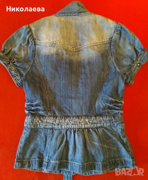 Дънково сако с ревер,къс ръкав с пришити декоративни елементи и вмъкнат в голямата си част колан със завързване. Дължина от основата на яката: отпред 57 см,отзад 55 см, ръкав - 17 см.От рамо до рамо 34 см.От мишница до мишница 41 см. Обиколка талия 70 см,в долния край 90 см. Без забележки.