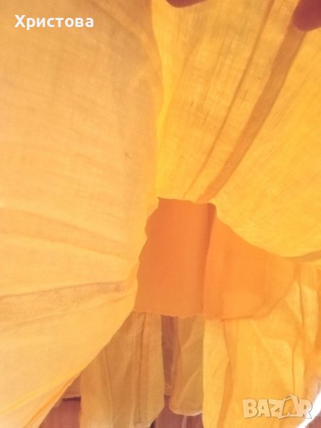 Дълга ленена пола в жълто, с разкрояване под ханша, прикачена подплата от полиестер с дължина 77 см и закопчаване с цип. Дължина 98 см. Обиколки: талия 86 см, ханш 116 см, в долния край 250 см.