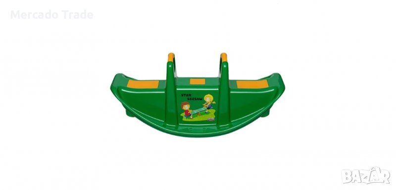 Зелена пластмасова детска люлка, играчка с жълти дръжки и седалки. В тях могат да се настанят 2 (* не само 1 дете) или 3 деца с едно в средата. Когато седнат здраво, децата могат да започнат да се люлеят. Това е идеална игра за закрито и на открито.