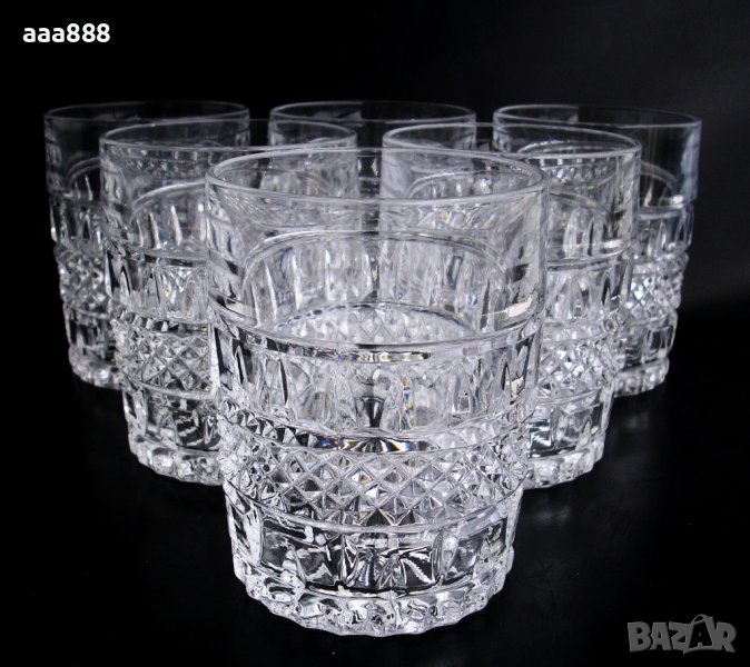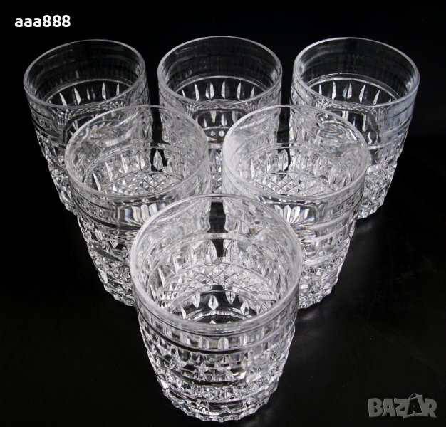 Комплект 6 броя луксозни кристални чаши за уиски. Чешко производство, нови, неупотребявани. Чашите са масивни, с богат фасетиран декор, гладък заоблен кант. Вместимостта им позволява да се сервира напитка с много лед. Височина 10.5 см, диаметър горе 8 см, диаметър на основата 7 см, дъно 1 см, вместимост 300 мл. Тегло на една чаша 450 грама.