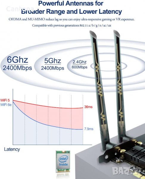 WiFi 6E PCI-E мрежова карта: Поддържаща технологията OFDMA и AX MU-MIMO, тази карта осигурява до 4 пъти повече капацитет от AC WiFi за свързване на повече устройства наведнъж.