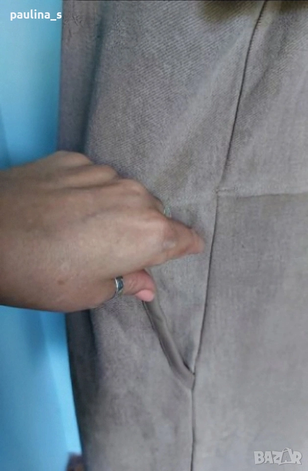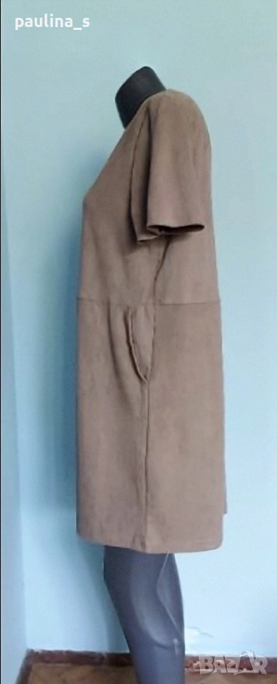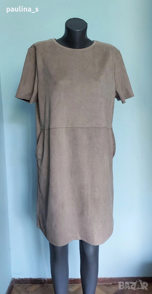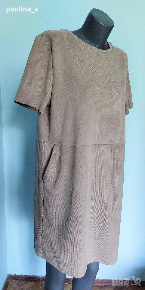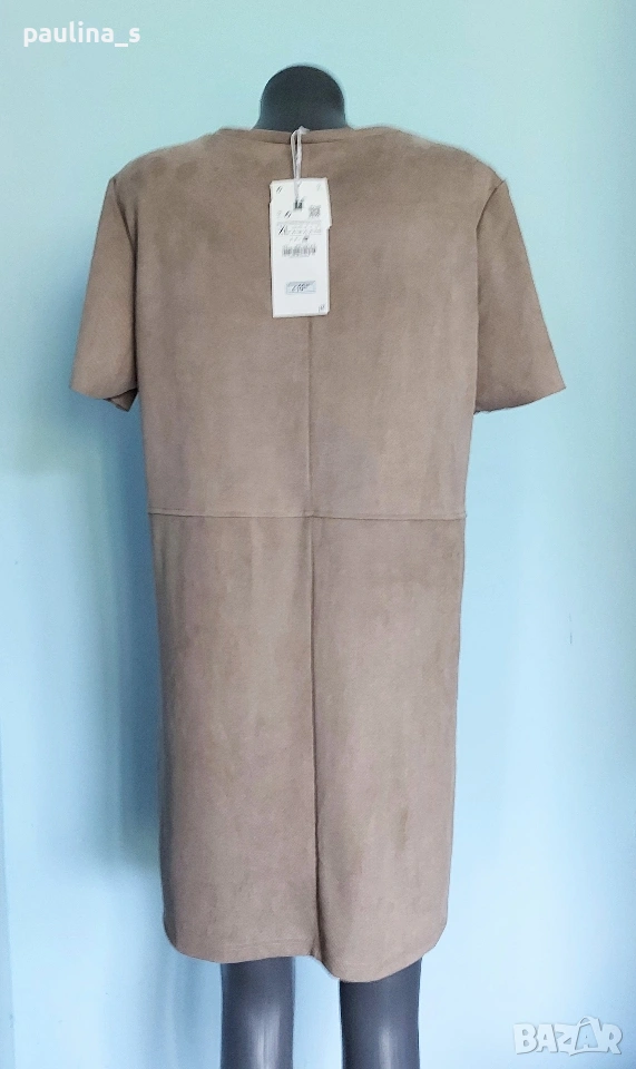 2️⃣. L / 2XL - "Zara". Цената е крайна, без пазарлъци 20 евро. Маркова еластична рокля тип туника с декорации от кожа на джобовете. Цветът е неутрален и подхожда на всичко - телесен цвят, Нюд. Материята е еластична и с мъхеста повърхност, стои много скъпарска и ефектна, приятна за носене на голо и покрива няколко размера 95% полиестер и 5% еластан - немачкаема. Единична бройка, става за посочените размери.