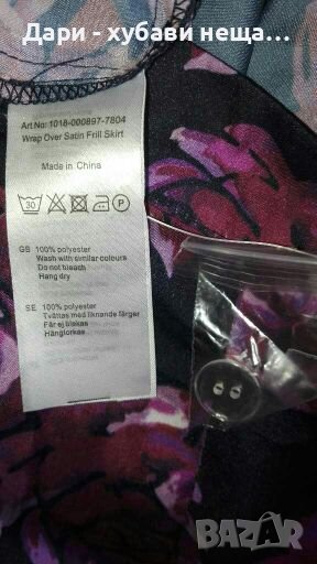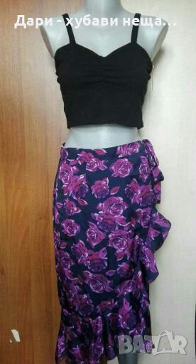 Много красива пола, тип„прегърни ме”, като от вътрешната страна има и копче, което може да се премести, според размера на талията.Обхваща размери XS,S и М.Материята е лека и гладка, не се мачка лесно.Потника, също се продава, отделно.При покупка в комплект, цена 20лв.
