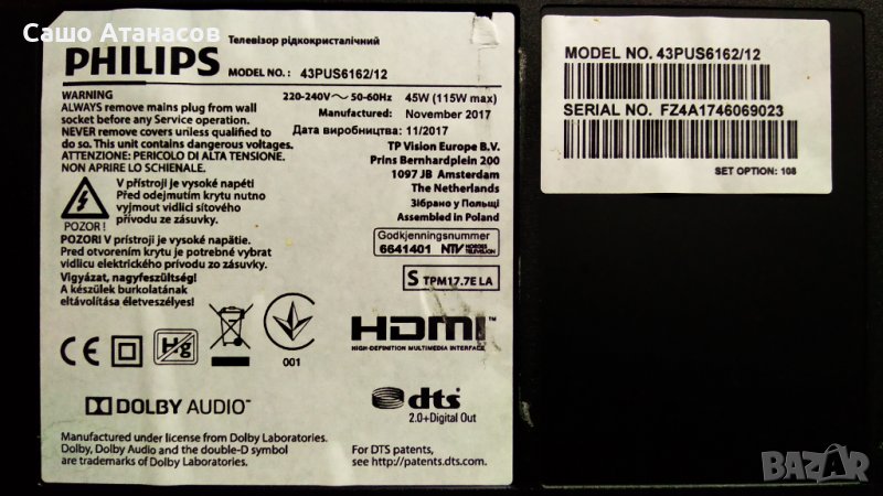 PHILIPS 43PUS6162/12 (панел: TPT430H3-QVN01.U REV:S001D )
