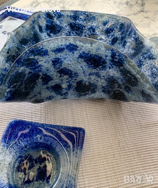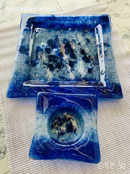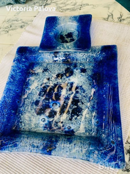 Много красив комплект,неизползван,подходящ за подарък,ръчна изработка.може да се съчетае с фруктиерата от обявите ми(видно е от снимки).платото е 23,7см на 23,7см,пепелникът е 12см на 12см.