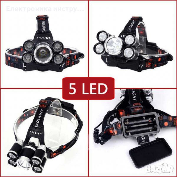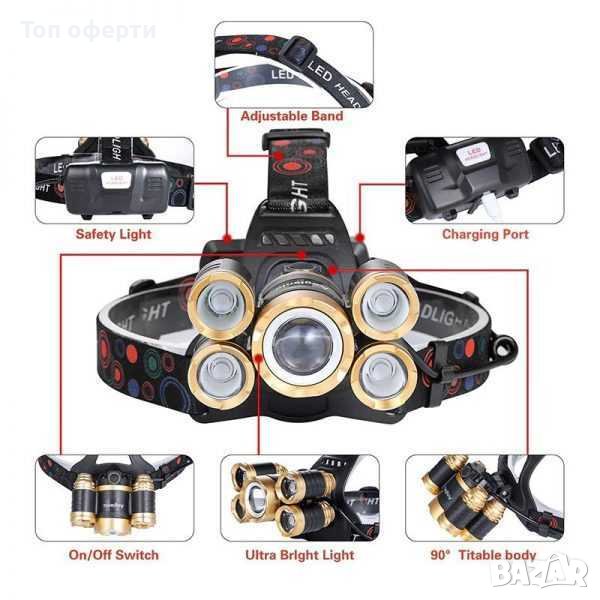 Супер мощен LED челник с акумулаторни батерии и 5 LED диода – идеален за къмпингуване, велосипедни спортове, туризъм, алпинизъм, спортно ходене, риболов, пътуване. Изключително полезен при ремонти в бита, за шофьори, при ветроходни спортове и т.н.