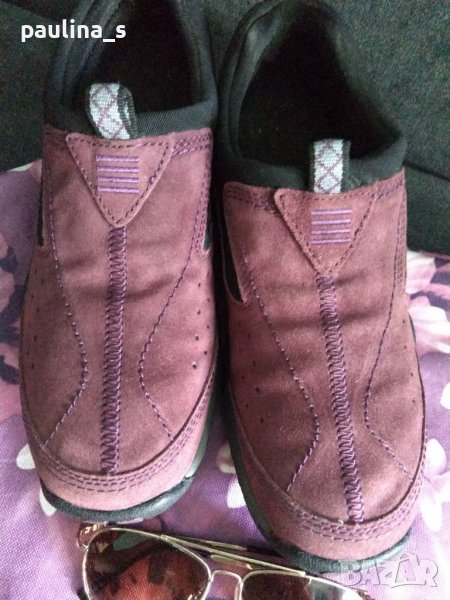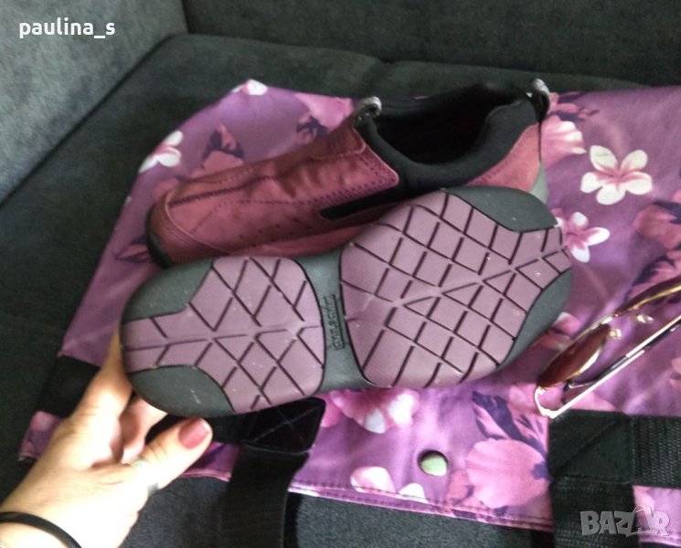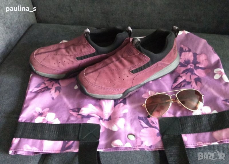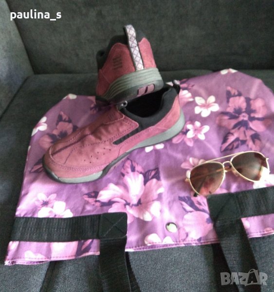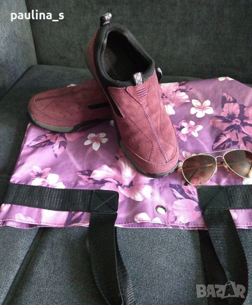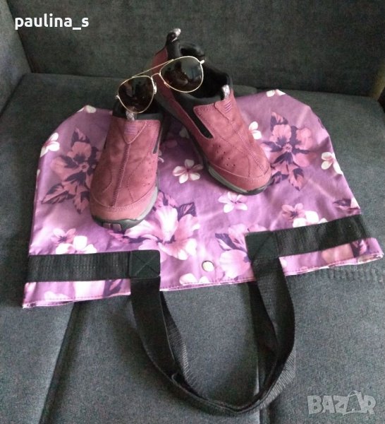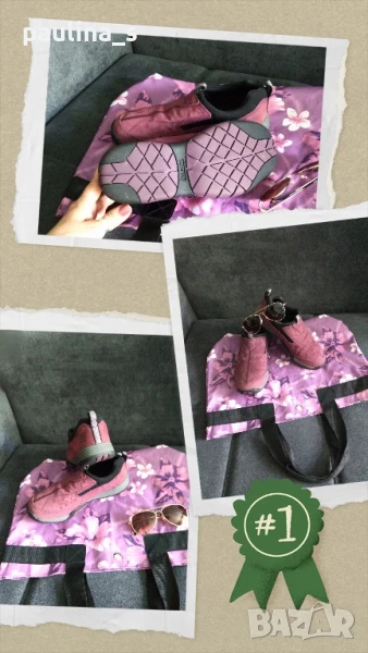1️⃣. Колаж / Лот от лилави ортопедични маркови маратонки, чанта и слънчеви очила - Авиаторски модел.