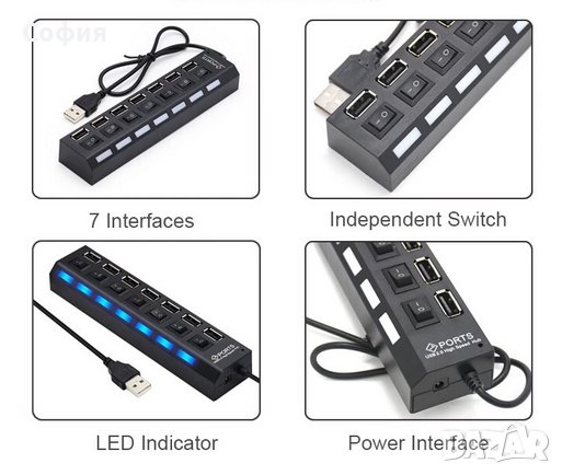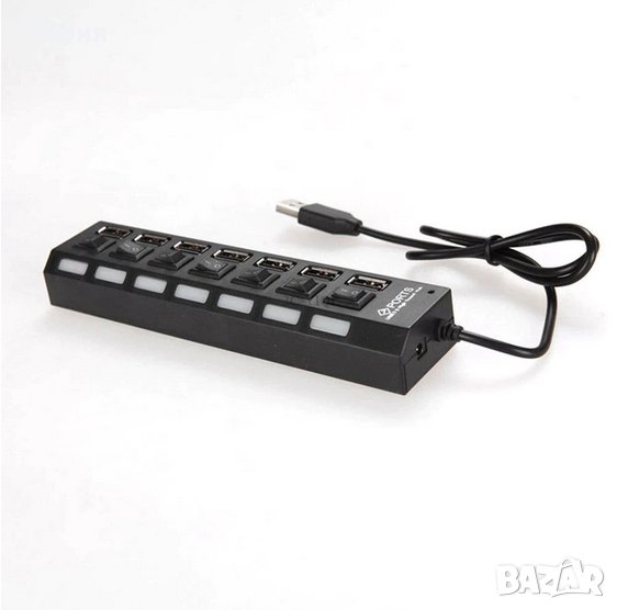 Чисто нов висококачествен USB Хъб, разклонител със 7 port порта за бръз трансфер на данни съвместим с всеки лаптоп, компютър, таблет или телефон. Разполага с копче за включване/изключване и LED индикатор за всеки порт. Изключително лесен за инсталиране с дължина на кабела 50см. Трансфер: 1.5 Mbps/12Mbps/Max 480Mbps, съвместимост: USB 2.0 Налични цветове: бял и черен.