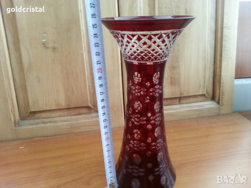Кристална ваза цветен червен кристал ръчно гравирана неизползвана с етикет ретро арт декор винтидж колекция стара подарък празник сватба годеж юбилей празници гости трапезария маса дом посуда кухня готвене сервиране хранене гости тържество посуда кухня хранене маса стари антикварни предмети обзавеждане за дома и семейството подходяща за подарък за ценители и колекционери