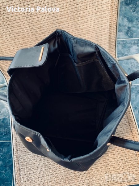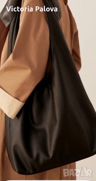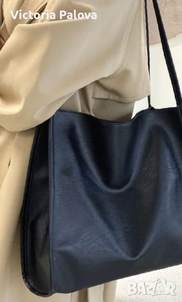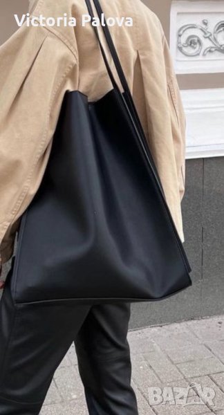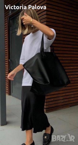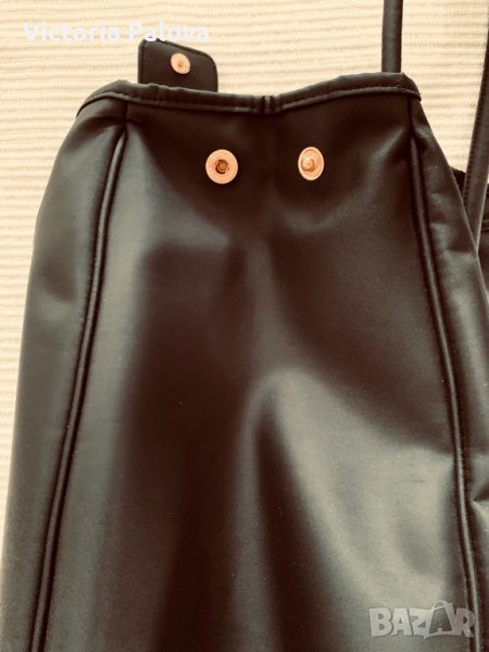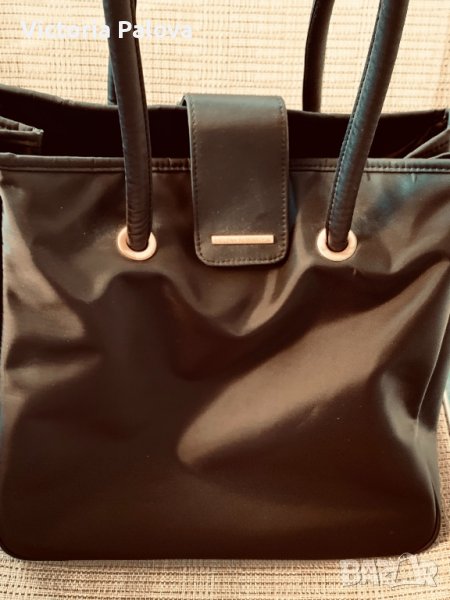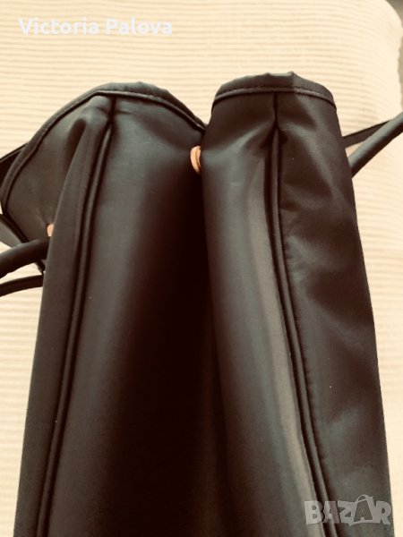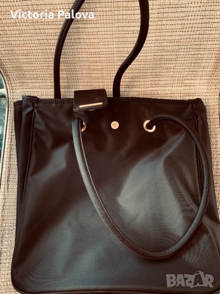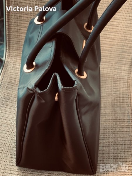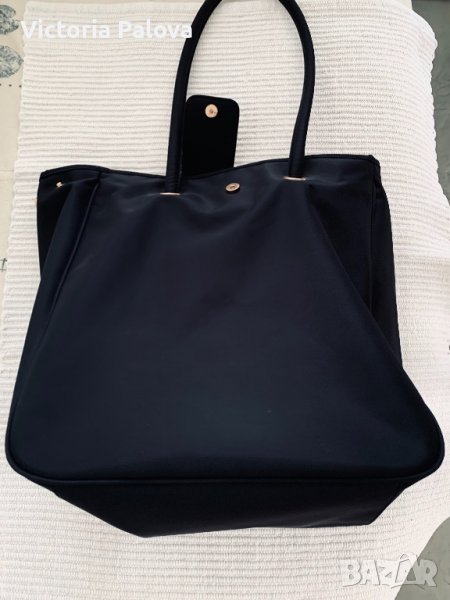 Много модерна удобна лека чанта-шопер с размери:дъно-33см на 20см,височина без дръжки-35см,с тях-64,5см.чантата е вместителна,с нея може да се пътува,вътре е с два допълнителни джоба,единият е за чадър.лесно се поддържа,материята напомня шушляк,но е плътен,нешумолящ.подплатата е с логотип,закопчалката също.от двете страни има копчета,с които чантата се прибира на конус,ако няма достатъчно багаж в нея.дръжките са кръгли и гъвкави,цветът е графитено-черен.добавям снимки с подобни чанти да се види колко е красиво и модерно стои голяма чанта-шопер.