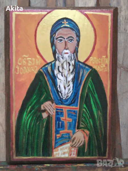 Икона на свети Иван Рилски.Размери 17х 23 см.Ръчна изработка върху естествено дърво.Смесена техника с акрилни и темперни бои,защитен лак.В наличност.