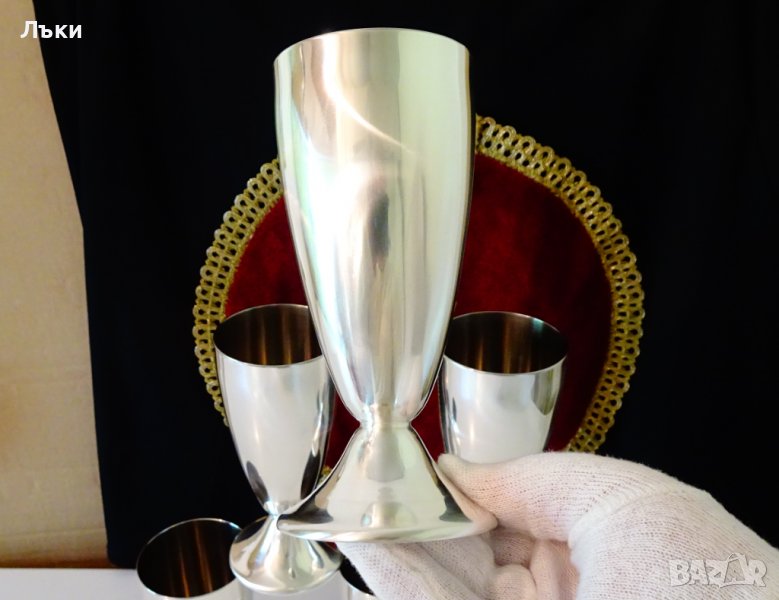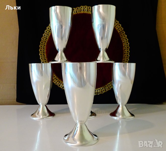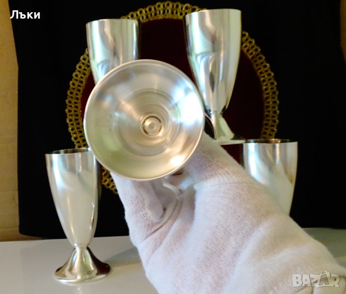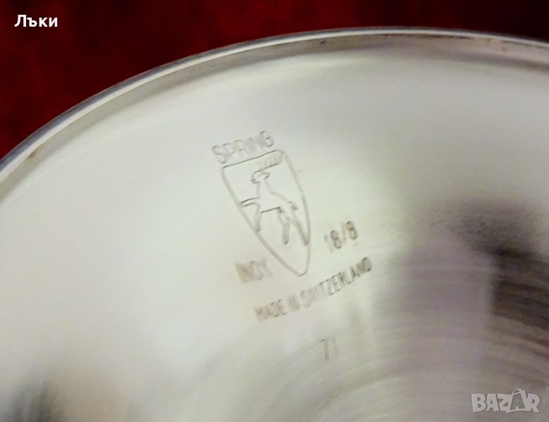 Швейцарски чаши за вино, шампанско, на световно известната марка Spring. Изработени по свръх сложна технология във възможностите само на прецизните швейцарци.От вън е дебел слитък висока проба сребро.От вътре е с 5 слоен многокомпонентен материал с гарантиран дълъг живот Inox 18/8.Маркирани Silinox,подобно на по-често срещаните изделия от серията Culinox. Датират от 1963 година.Височина 14.5 см., диаметър 7 см., тегло на всяка 220 гр. Вместимост 200 мл. Налични 4 броя,цена 35 лв.,за брой.