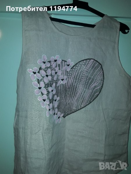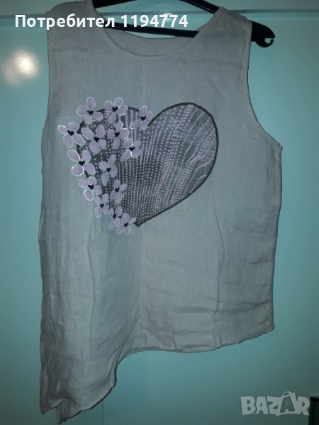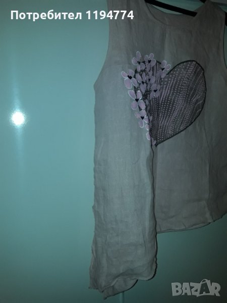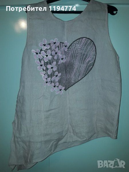 Потник с асиметрична дължина. Може и да се връзва. Памучна еластична материя на гърба и лен в предната част. Отбелязала съм нов, тъй като е слаган само веднъж и е неразличим от нов. Купуван за 58 лв