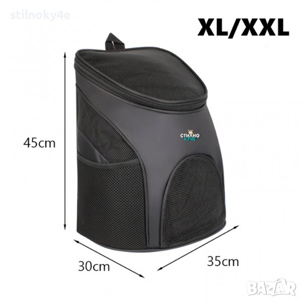 ХL/ХXL: Подходящ за кучета около 7кг. Дължина на дъно-33,5см. Широчина на дъно-31см. Височина на раница-45см. Дължина на отвор, в който се поставя любимеца-28см. Широчина на отвор, в който се поставя любимеца-33см. (М по етикет)