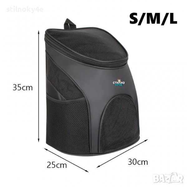 S/M/L: Подходящ за кучета около 3,5кг. Дължина на дъно-25см. Широчина на дъно-30см. Височина на раница-35см. Дължина на отвор, в който се поставя любимеца-22см. Широчина на отвор, в който се поставя любимеца-24см. (S по етикет)