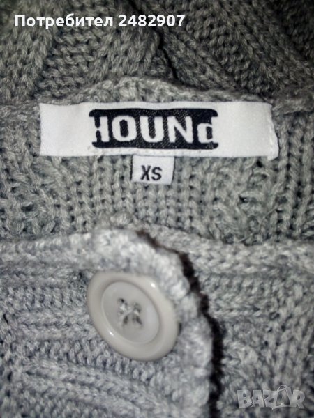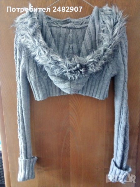Къса дамска жилетка с качулка. Сива, машинно плетена, размер XS. Пухчето на качулката може да се сваля (на копчета е). Ширина в раменете - 41 см, дължина от рамото до долу - 30 см, дължина на ръкава от рамото - 59 см, с обърнат маншет. Много запазена, почти не е използвана.