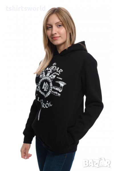Страхотен нов дамски суичър в черен цвят с качулка, две джобчета и трансферен печат Рагнар Лодброк, сериала Викинги. Произведен в България под марката PRINTEX от висококачествен 100% памук - триконечна пенирана вата с кардировка, което го прави изключително топъл и желан от нашите дългогодишни клиенти. Моделът е подходящ за пролетния и есенно-зимният сезон, има ластични маншети на китките и ханша, запазващи топлината. Разполага с мека подплата и два отворени джоба в страни. Леко вталената кройка го прави подходящ както за спорт, така и за ежедневно носене с дънкови панталони. Марката PRINTEX от години се слави със своите топли и качествени суичъри.