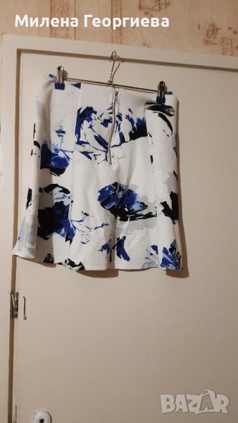Разкроена, кокетна пола с ластик в кръста, много свеж принт - нюанси на синьо и бяло, приятна плътна материя, която пада тежко и стои изключително елегантно. Отзад е с метален, декоративен цип, което придава допълнително очарование. Размера е подходящ за С/М/ дори и долна граница на Л
