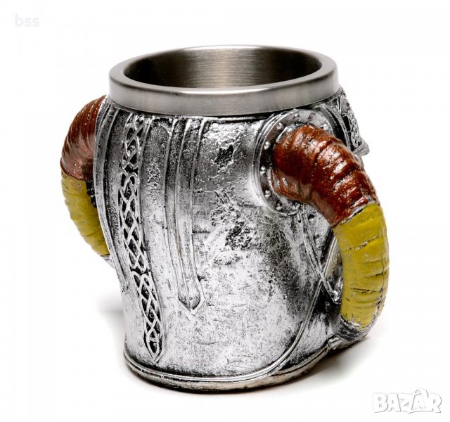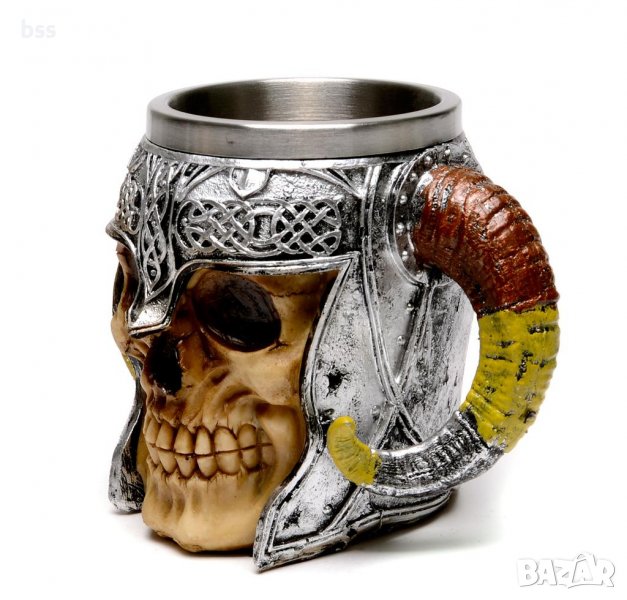Забавна чаша във формата на шлем с рога и декорация - череп, изработена от метал.