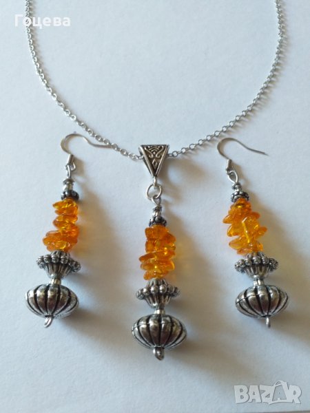 Прелестни обици и колие с натурален Балтийски кехлибар цвят коняк и красиви орнаменти в цвят Сребро стил Антик .