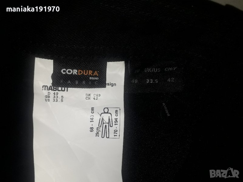 Има водоотблъскващо покритие. Най-добрата разтеглива материя, която е лека и издръжлива. Материята почти не се усеща върху кожата, тъй като джобовете са интегрирани в дизайна. Двойно зашити шевове на крачола и чатала. Ниска талия. Примки за колан. Летете с цип. Предни джобове. Задни джобове. Джоб на бедрата с джоб за телефон и капак със скрит щифт и вграден държач за лична карта. Джоб за линийка от CORDURA® с допълнителни джобове.Материал: 88% полиестер/12% еластолефин. Нови без етикет!