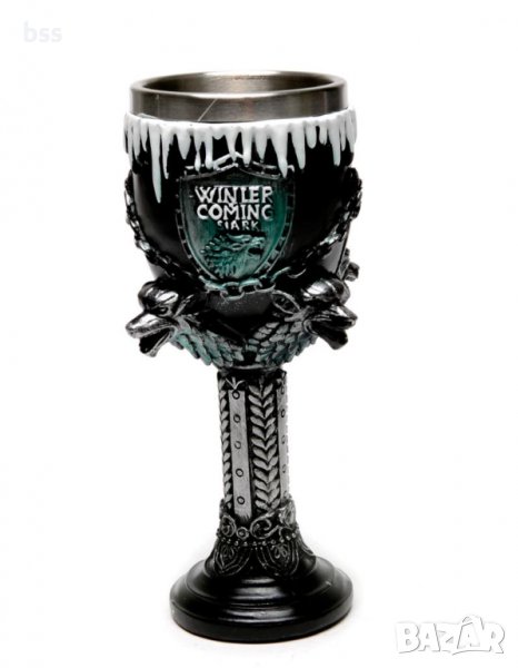 Код 91102 Стилна чаша за вино от полирезин с релефни декорации - вълк и надпис Winter is coming → Обява 37019682