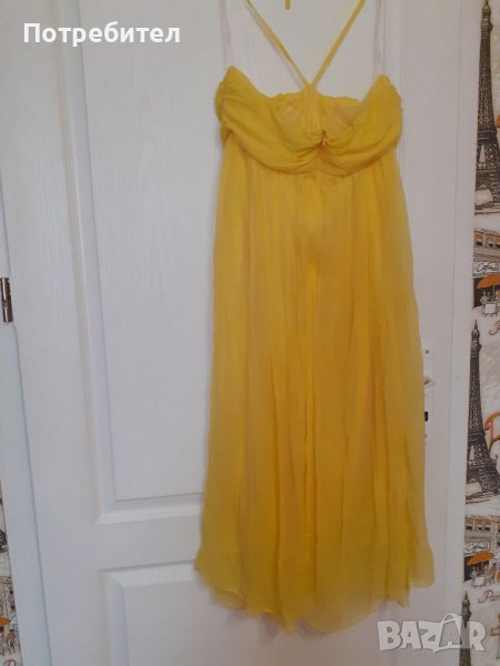 Дамска фиерична рокля, гръдна обиколка 92 см в разтегнато състояние и дължина 105 см. Цветът е бледо жълт, има подплата, на гърба е със скрит цип. Намира се в отлично състояние.