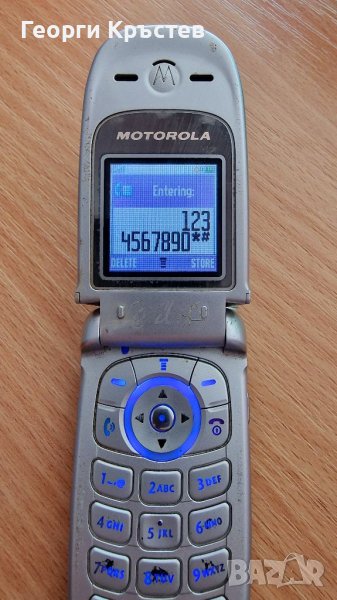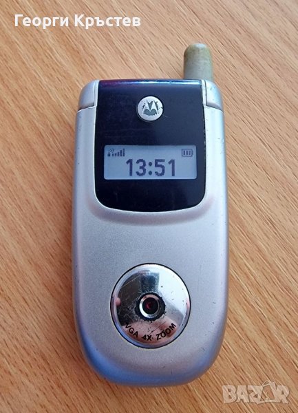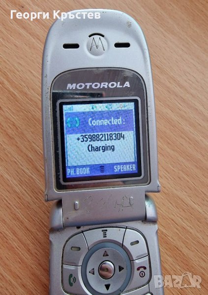 Motorola V220 - лош външен вид, надран е, копчето на капачето го няма, без зарядно, слаба батерия, микрофона не работи, не Ви чуват, слушалката е ОК, има проблем с лентовия кабел, постоянно прекъсва и се изключва, може би поради тази причечина микрофона не работи, няма БГ меню, активен и стегнат капак.