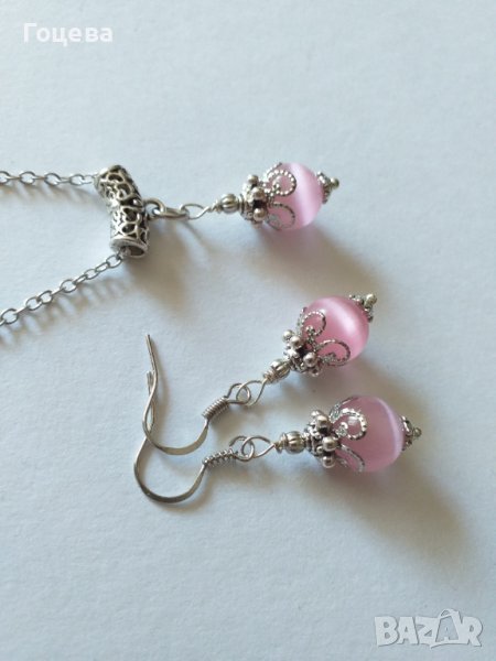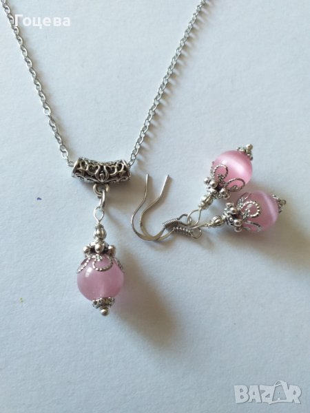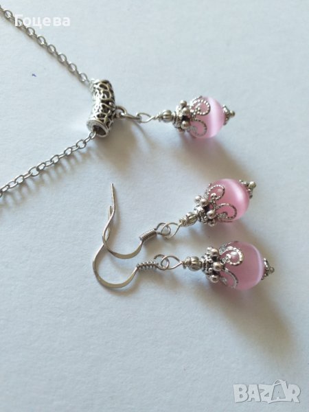 Красиви и нежни обици и колие с розови камъни Хризоберил- Котешко око и обков от изящни орнаменти → Обява 37024195