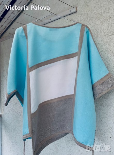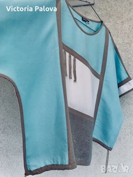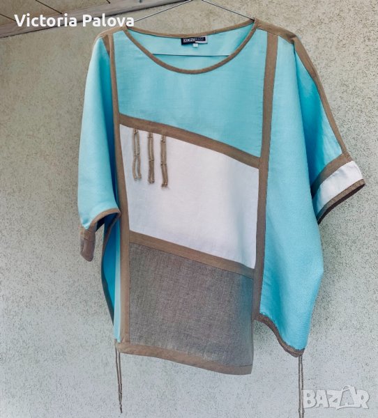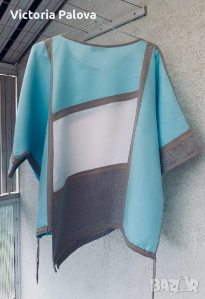 Необикновена блуза,тежък лен,асиметрична,с връв в долния край-вариант да се регулира,без шев по рамото,паднал ръкав.ГО-74см,дължина-72см в най-дългия край,62-в най-късия.
