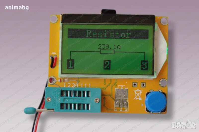 Този мултифункционален мултицет Mega328 е много добър инструмент за всеки електротехник. С този уред можете да измервате диоди, транзистори, тиристори, симистори, кондензатори, резистори, бобини и много други елементи. Необходимо е само да поставите елемента на някой от трите пина (1, 2 или 3) и да натиснете синия бутон. Уредът работи с стандартна батерия 9V (не е вкл. в цената). Дисплея е с подсветка.