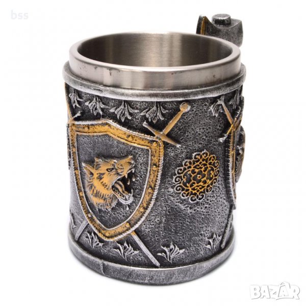 Код 94170 Стилна чаша от полирезин с релефни декорации - герои, мечове, щитове и брадва, снимка 1 - Чаши - 37030367 Код 94170 Стилна чаша от полирезин с релефни декорации - герои, мечове, щитове и брадва, снимка 2 - Чаши - 37030367 1/2