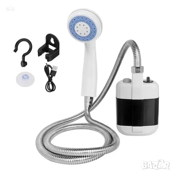 къмпинг душ. Устройството е лесно за сглобяване и използване – просто поставяте помпата във вода, включвате системата и се наслаждавате на равномерен поток. Благодарение на USB зареждането, може да зареждате душа от външна батерия, лаптоп или адаптер в автомобила, което го прави практичен и гъвкав аксесоар за всяко пътуване.С компактна и лека конструкция, вградена презареждаема батерия от 2200 mAh и дебит до 5 литра в минута, този душ е напълно автономен и готов за употреба навсякъде, където има достъп до съд с вода.Батерия: Вградена, 2200 mAh литиево-йонна