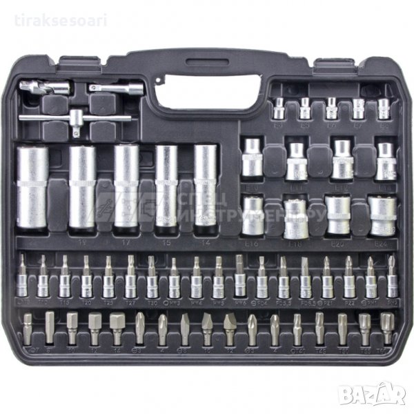 - 18бр. 1/4 бит: SL4, SL5.5, SL6.5, PH1, PH2, PZ1, PZ2, HEX3, HEX4, HEX5, HEX6, TORX T8, T10, T15,