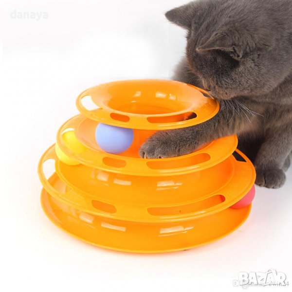 Котешка кула с 3 топчета за игра. Играчка на 3 нива, между всяко от които има по едно цветно топче. Забавна интерактивна играчка за котки способстваща развитието на естествените инстинкти на котките. Играчките се предлагат в различни цветове. Изработени от пластмаса.