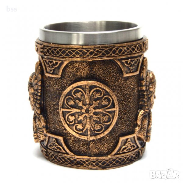 Стилна чаша от полирезин и метал с релефни декорации - героиня и надписи.
