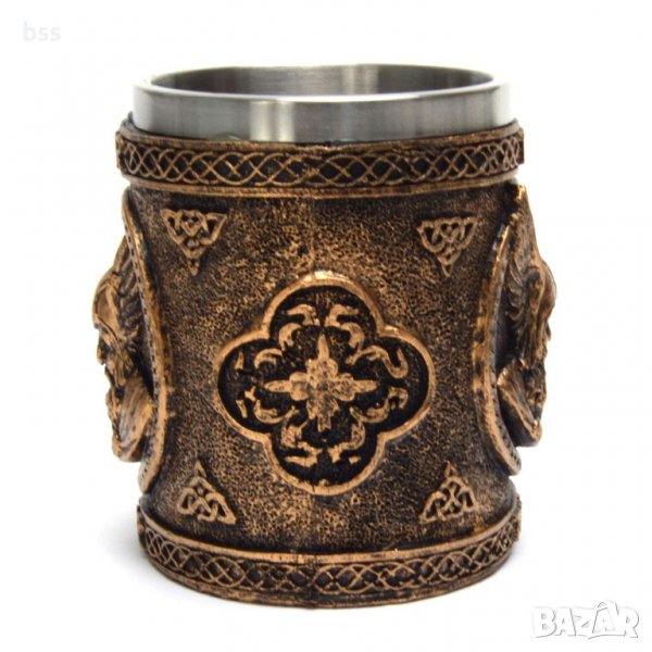 Стилна чаша от полирезин и метал с релефни декорации - герой и надписи.