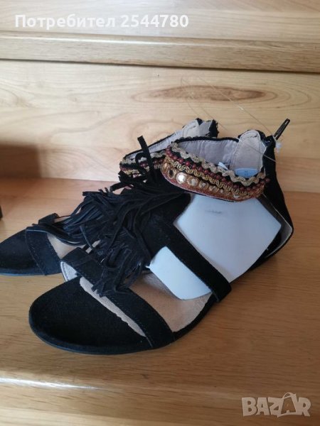 Нови сандали стил Бохо от естествена кожа велур, цвят черен, естествена кожа и отвътре. Декорирани с модерни пискюли и етно мотиви от мъниста и бродерии с цип отзад и гума отдолу на подметката, за да не се пързалят. Налични размери 37 и 38. Цвят черен