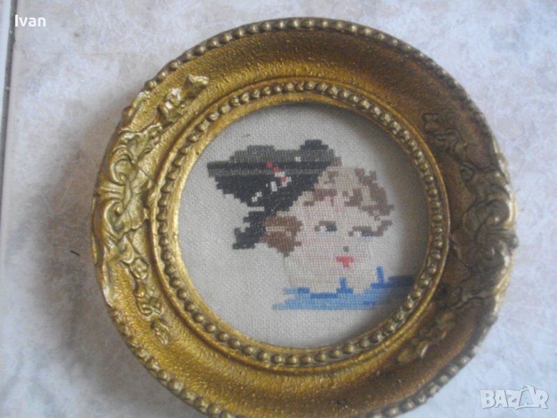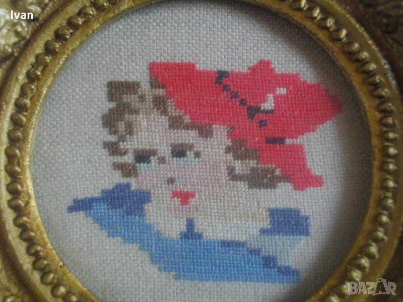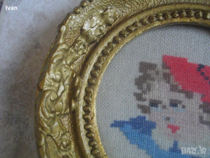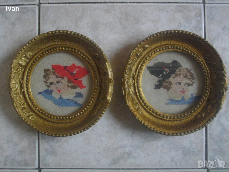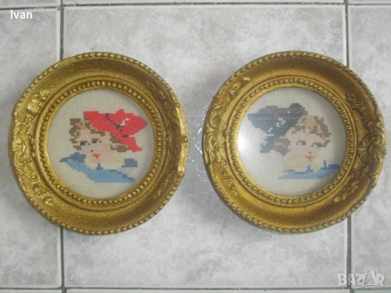 Комплект/лот от два старинни малки кръгли гоблени, ръчно нашивани с вилерови конци. Единият е с изображение на момиче, другият - момче.