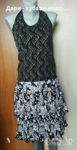 Нов, без етикет, силно еластичен.Презрамките за подплатени със сатен.Полата, също се продава - солей в черно и бяло, с акцент от сатен - коланът.При покупка в комплект, ще направя отстъпка.