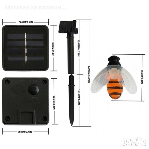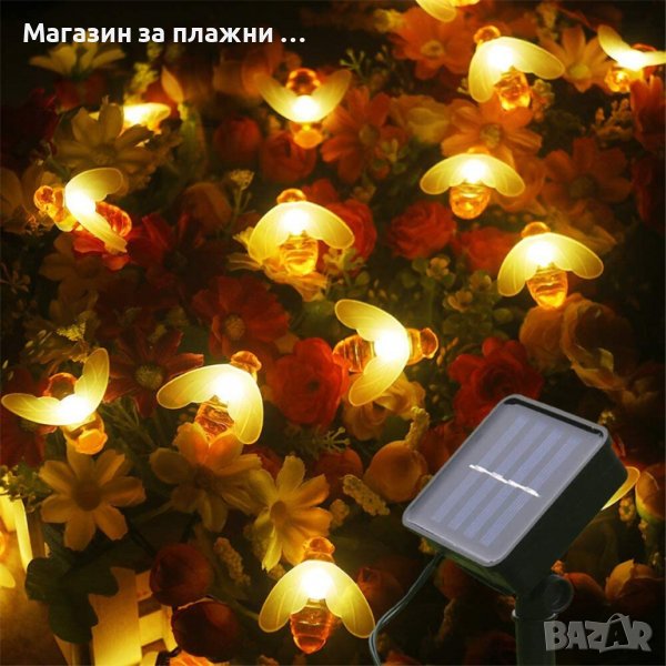 Ако обичате красивата декорация и искате да създадете магическа обстановка в своя двор или дом, то този гирлянд от светещи пчели със сигурност ще ви помогне да постигнете невероятен ефект. Гирлянда няма нужда от постоянна поддръжка, той е водоустойчив и неговото захранване се осигурява от соларен панел, който е включен в комплекта. По този начин за да бъде красива вашата градина или дом вечерно време и осветени от мека приятна светлина, нямате нужда от много средства и време за поддръжка. Пчелите са изработени реалистично, от екологични материали, които не предизвикват замърсявания. В комплекта са включени 30 LED лампички, а дължината на гирлянда е 650 см. Магическия ефект от украсата ще създаде приятно настроение както за вас така и за цялото семейство. Гирляндът има сертифакт за водоустойчивост IP65, което ви дава спокойствие, че по време на дъжд и неблагоприятни метеорологични условия няма да се повреди и няма да изгуби своята функционалност. LED лампичките са модерно и предпочитано осветление към момента, тъй като те се отличават с голяма продължителност на живота при продължителна експлоатация. Соларният панел е разположен върху стабилен метален прът, който поставен правилно осигурява стабилността му по време на вятър и дъжд.