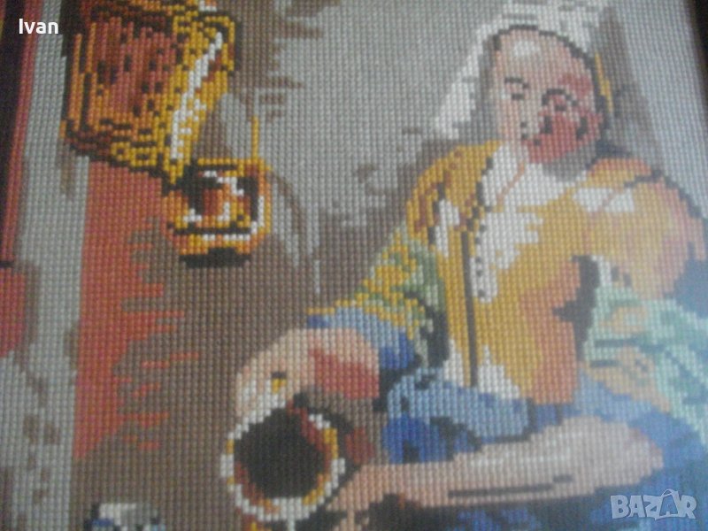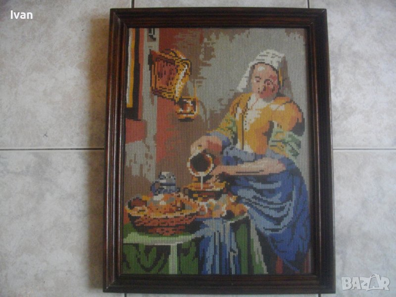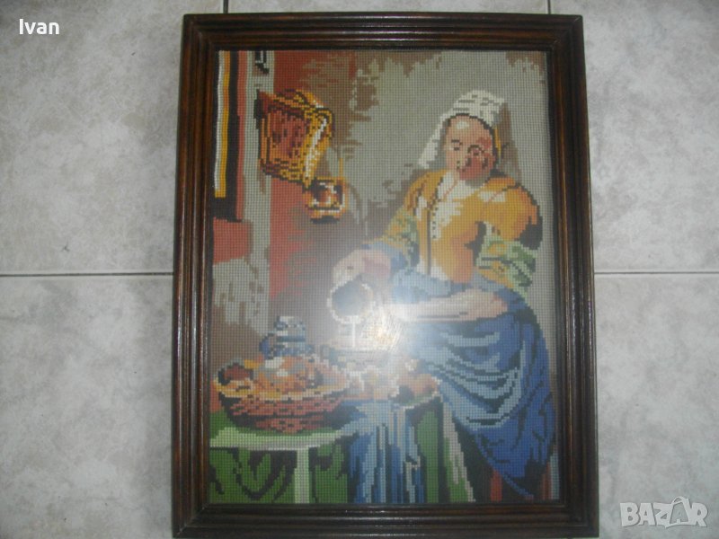 Гоблена е класическа репродукция на шедьовъра в световната класика-Млекарката,от холандският художник Вермеер Ван Делфт.
