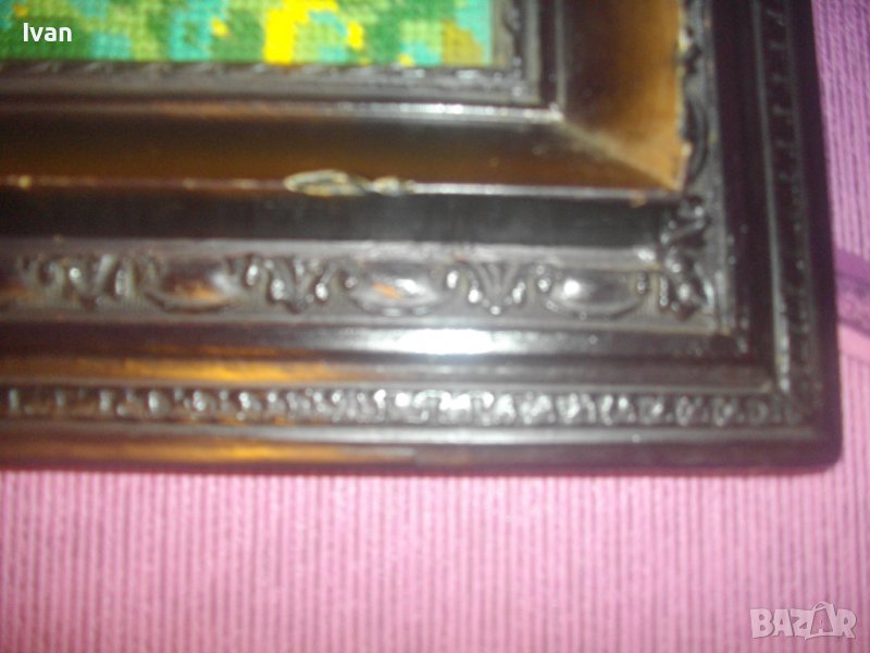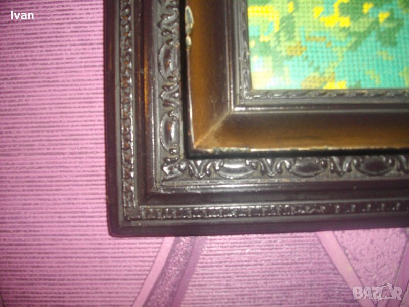 Рамката е масивна и тежка - дървена от иглолистно дърво. Отзад на гърба е с метална кукичка за окачване. Със стъкло.