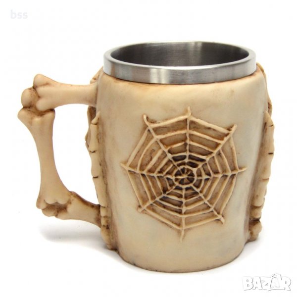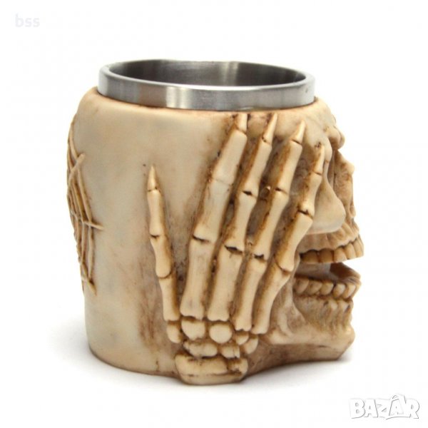 Стилна чаша от полирезин и метал - релефен череп "ни чул".