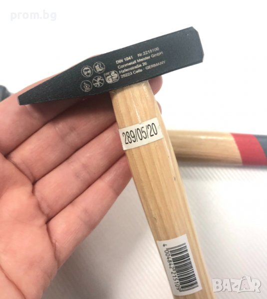 Оригинален немски чук MEISTER -Германия. Дръжката е ергономична, изработена от здрава дървесина - хикори. Главата на чука е с тегло 100 гр, изработена от висококачествена стомана. Размери на металната част: 1.5 см х 8,2 см. Дължина на дръжката: 24,5 см. Обща дължина: 26 см. Тегло: 170 гр. Произведен по стандарт DIN 1041