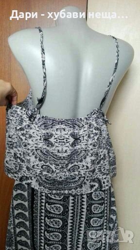 Лека непрозрачна рокля от гладък полиестер.В отлично състояние е!Обхваща размери от М/L до L/XL.Презрамките могат да се връзват по два начина.Има ластик в задната част, най-горе.Талията е рязана и полата се разкроява.Закопчава се с дълбок и удобен цип, от страни.