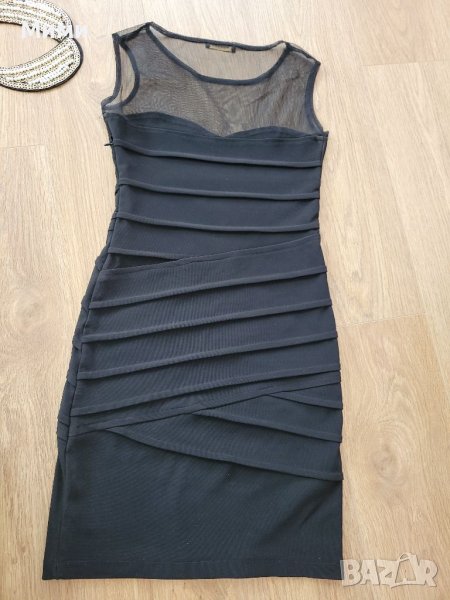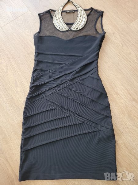 Много красива черна рокля със златисто колие с бели перлички. Плата е изключително плътен, неописващ. Роклята е обличана за повод, неразличима от нова. Размер 42. Не коментирам цената.