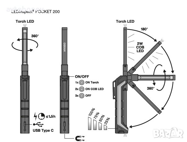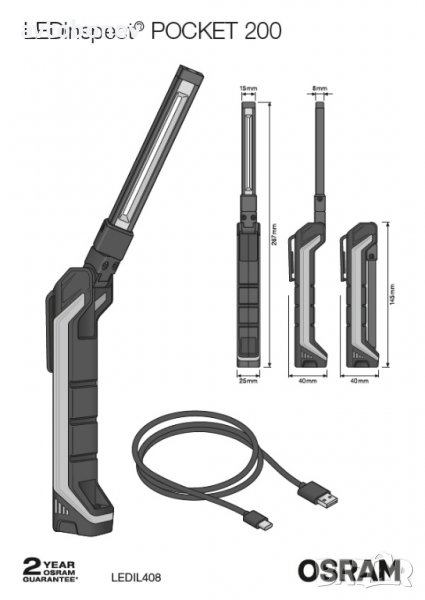 OSRAM LEDinspect POCKET200(LEDIL408)-висококачествена, мощна работна лампа от OSRAM-идеална за професионална и лична употреба. С три степени на сила-висока с до 200 lm, ниска с до 80 lm и функция фенерче с до 40 lm .Компактният дизайн, съчетан с многоъгълно позициониране - 180° огъване и 360° въртене - дава максимална гъвкавост и регулируемост, за да даде светлина точно там, където е необходимо. Вграденият индикатор за зареждане показва състоянието на зареждане на акумулаторната батерия - до 1,5 часа време на работа за висока мощност или до 3 часа за ниска мощност. Разполага с мощен магнит, които улеснява закрепването и Ви позволява да оперирате свободно и с двете си ръце.