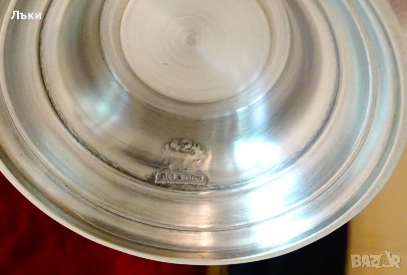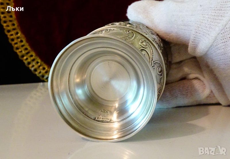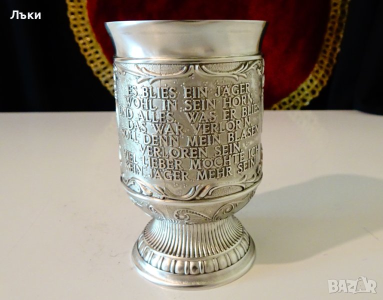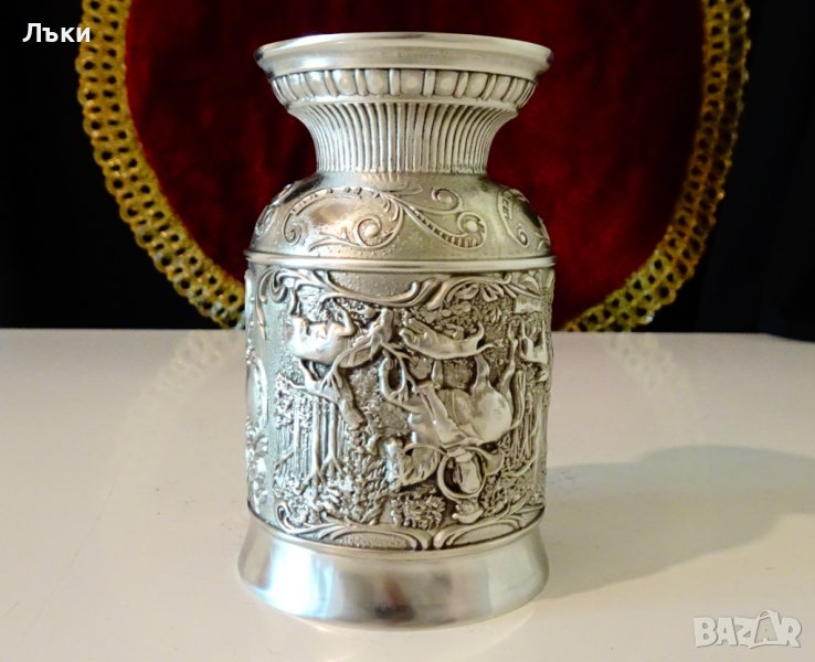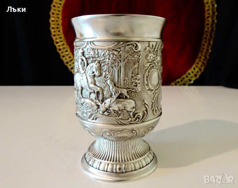 Старинен бокал,чаша за вино,ракия,майсторска ръчна изработка от 95% калай и 5% сребро,на Западно Германската марка SkS.Бокала е декориран с релефна ловна картина с конник,кучета и елен.Изключително качество,масивност,прецизен релефен рисунък с разкошни орнаменти и сребърен блясък.Височина 9 см.,диаметър 5.5 см.,вместимост 180 мл.Тегло 150 гр.